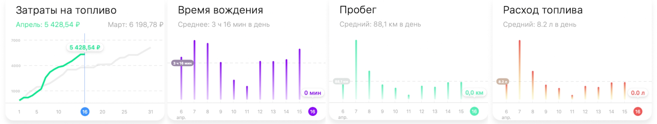 По умолчанию графики на экране статистики отображают статистическую информацию за последние 10 дней для графиков "Время вождения", "Пробег", "Расход топлива" и данные за текущий и прошлый месяцы для "Затраты на расход топлива".