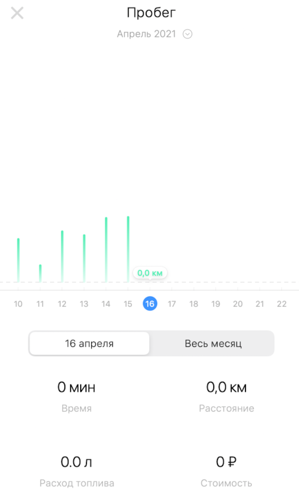 При нажатии на график на экране статистики открывается график с детальной информацией, который отображает статистику по пробегу за выбранный период.