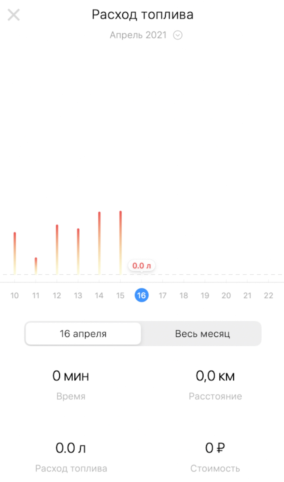 Вы можете просмотреть информацию (время, расстояние, расход топлива, стоимость) по конкретной дате или данные за весь месяц.